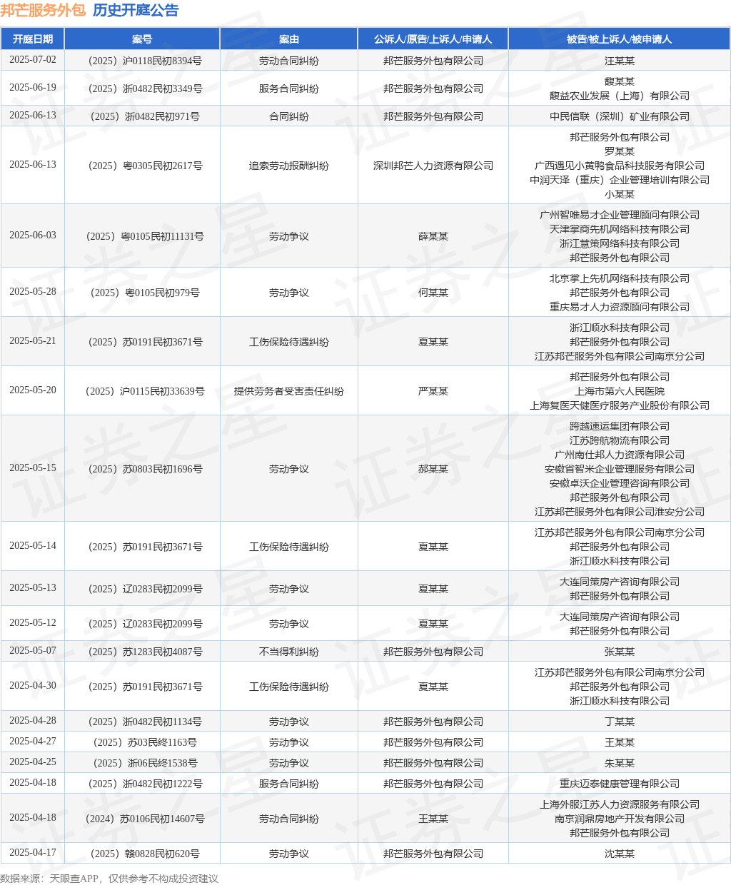 本站消息,根据天眼查APP显示,近日公布了一则邦芒服务外包有限公司作为被告/被上诉人的开庭公告,详细内容如下: